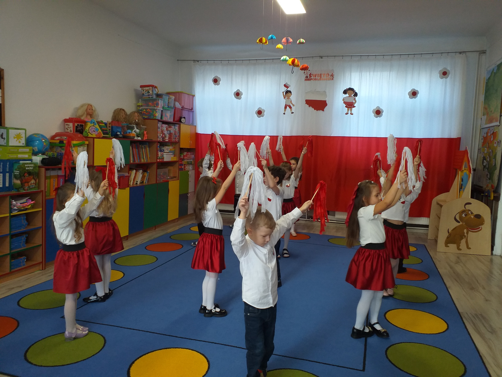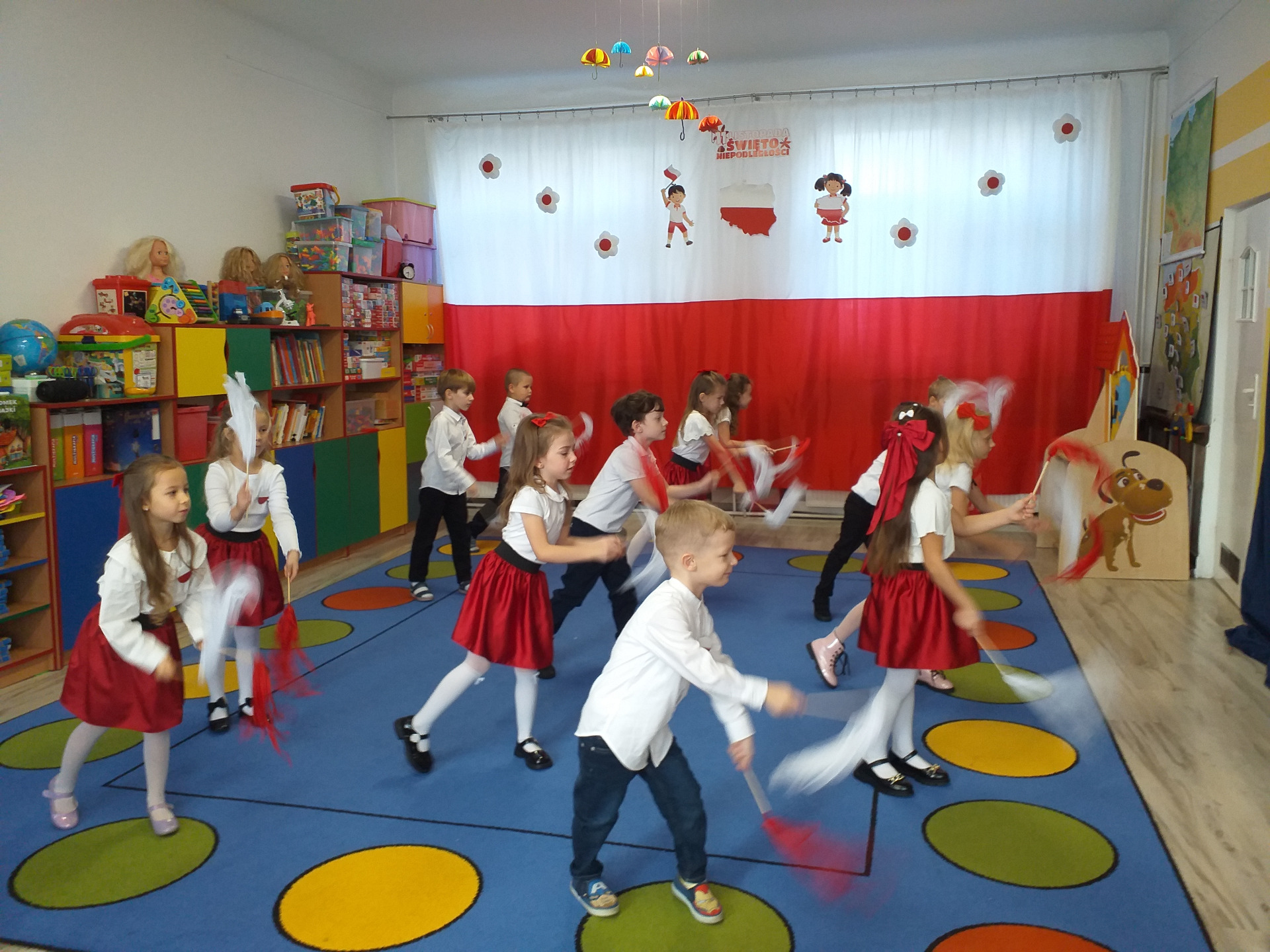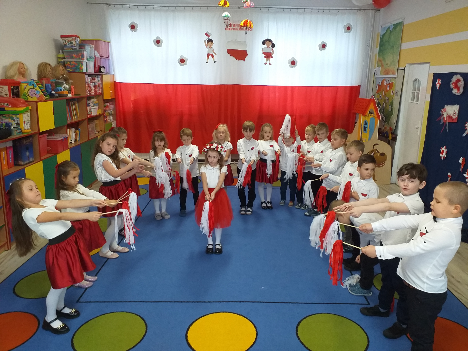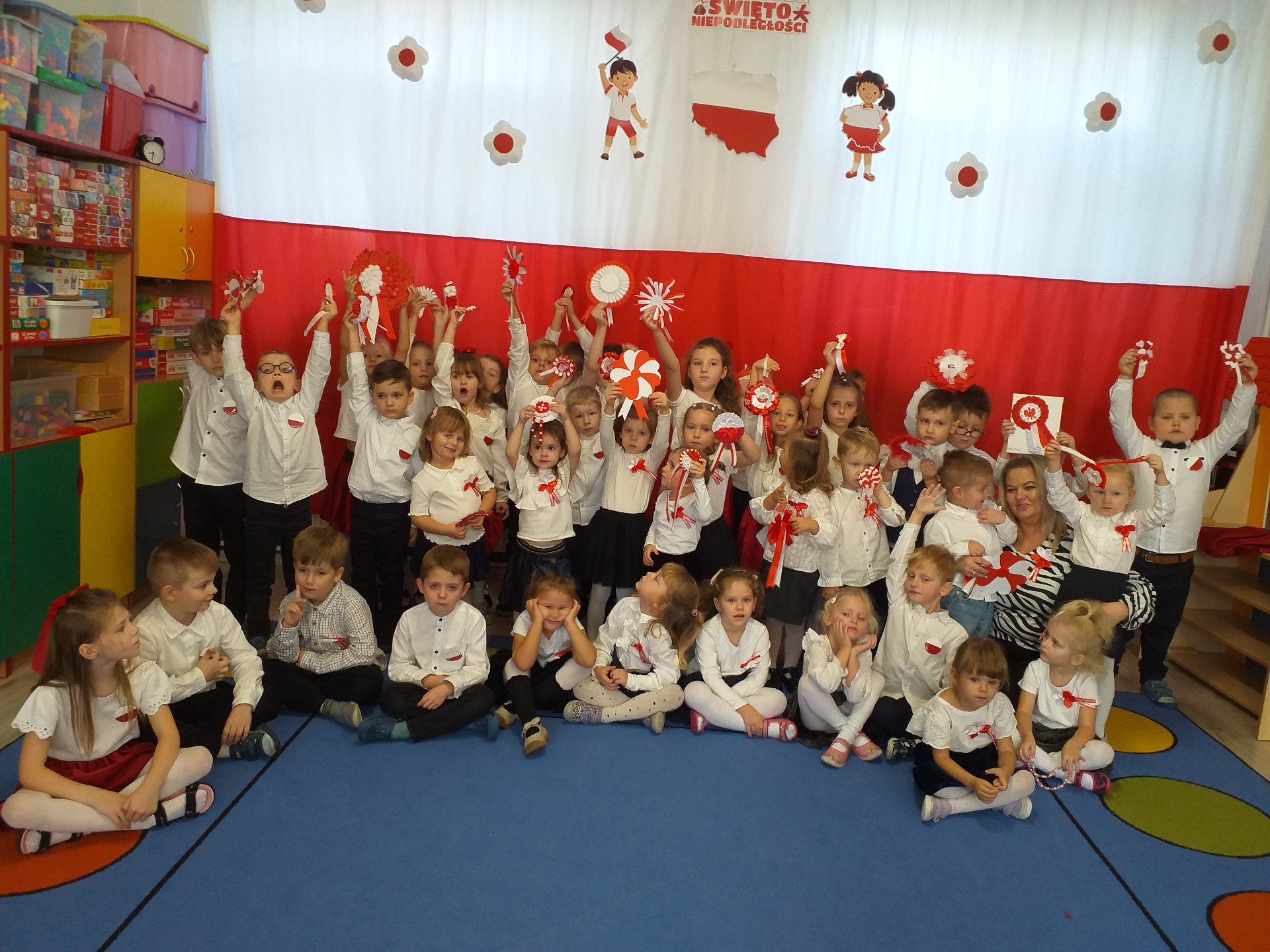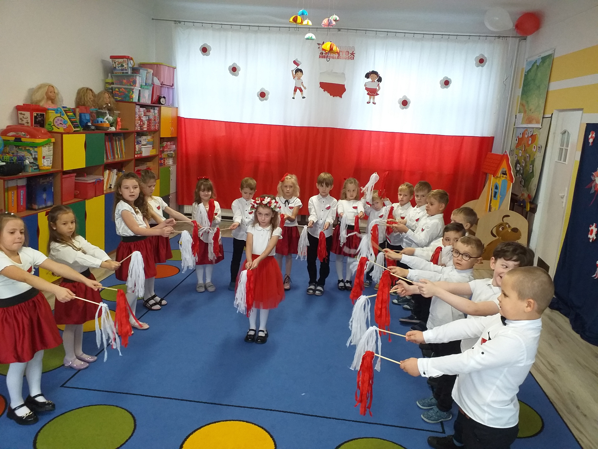 Dnia 07 listopada obchodziliśmy w naszym przedszkolu Święto Niepodległości. Z tej okazji wszystkie dzieci przyszły ubrane na galowo i uroczyście świętowali ten wyjątkowy dla Nas dzień. Ten dzień rozpoczął się rozstrzygnięciem konkursu "KOTYLION NARODOWY” Uroczystość dzieci rozpoczęły od tańca, następnie dumnie, przyjmując właściwą postawę „na baczność”, odśpiewały Hymn Polski „Mazurek Dąbrowskiego”. Głównym celem spotkania było kształtowanie miłości i przywiązania do naszego kraju ojczystego, jego kultury i tradycji oraz poznanie symboli narodowych naszego kraju. Dzięki udziałowi w tego typu uroczystościach przedszkolaki od najmłodszych lat uczą się patriotyzmu, kształtują pozytywne postawy i uczucia patriotyczne.