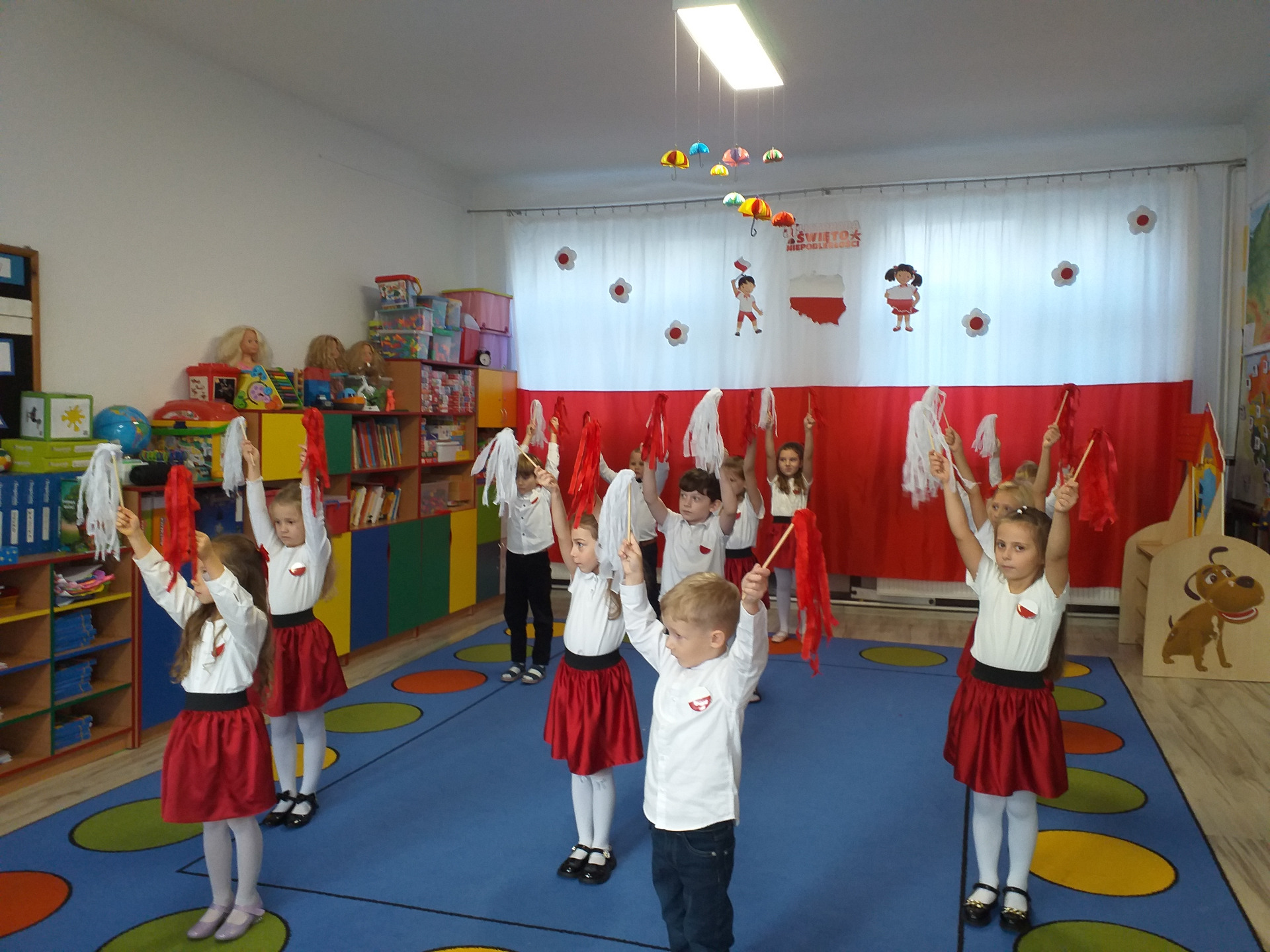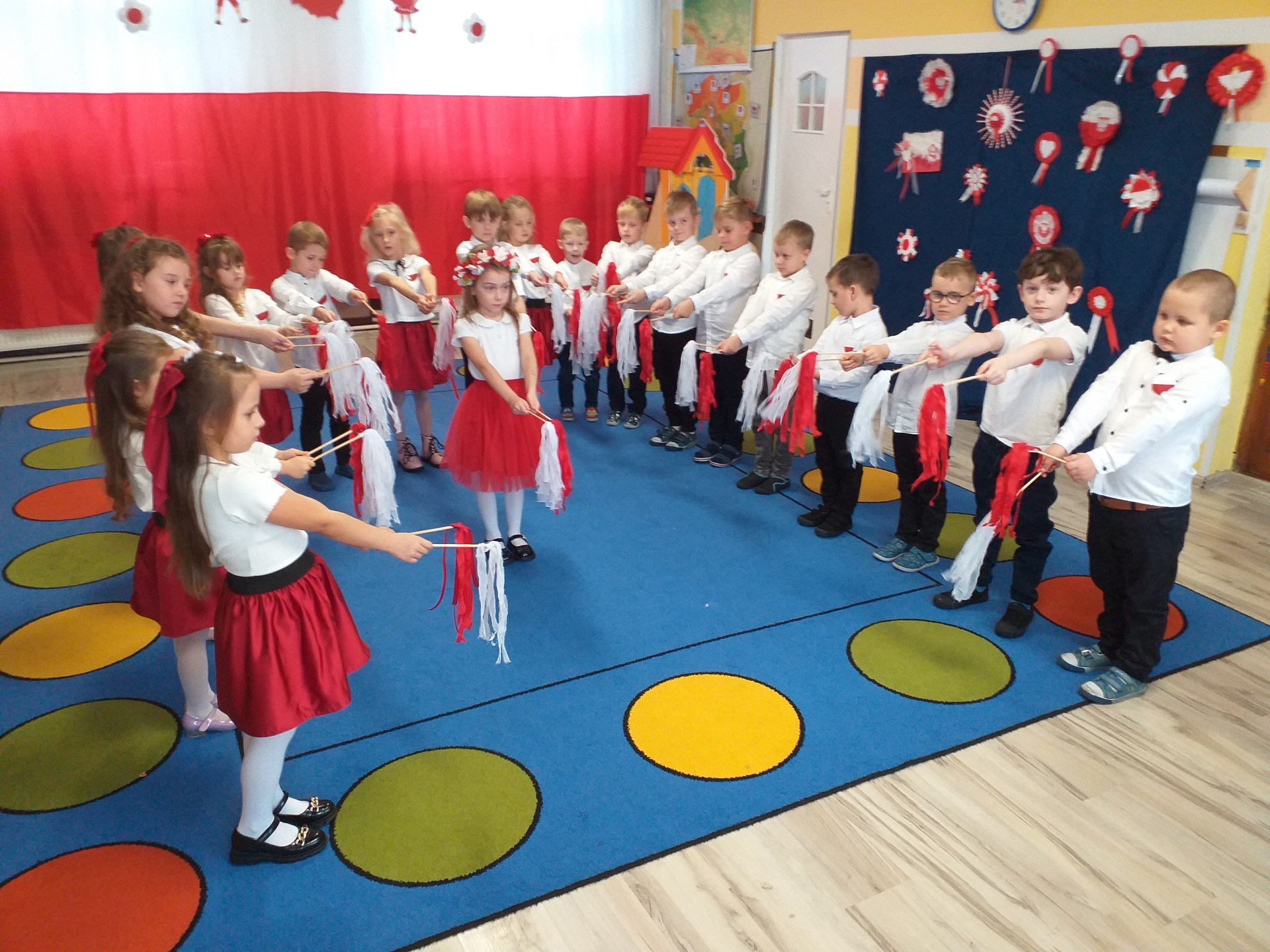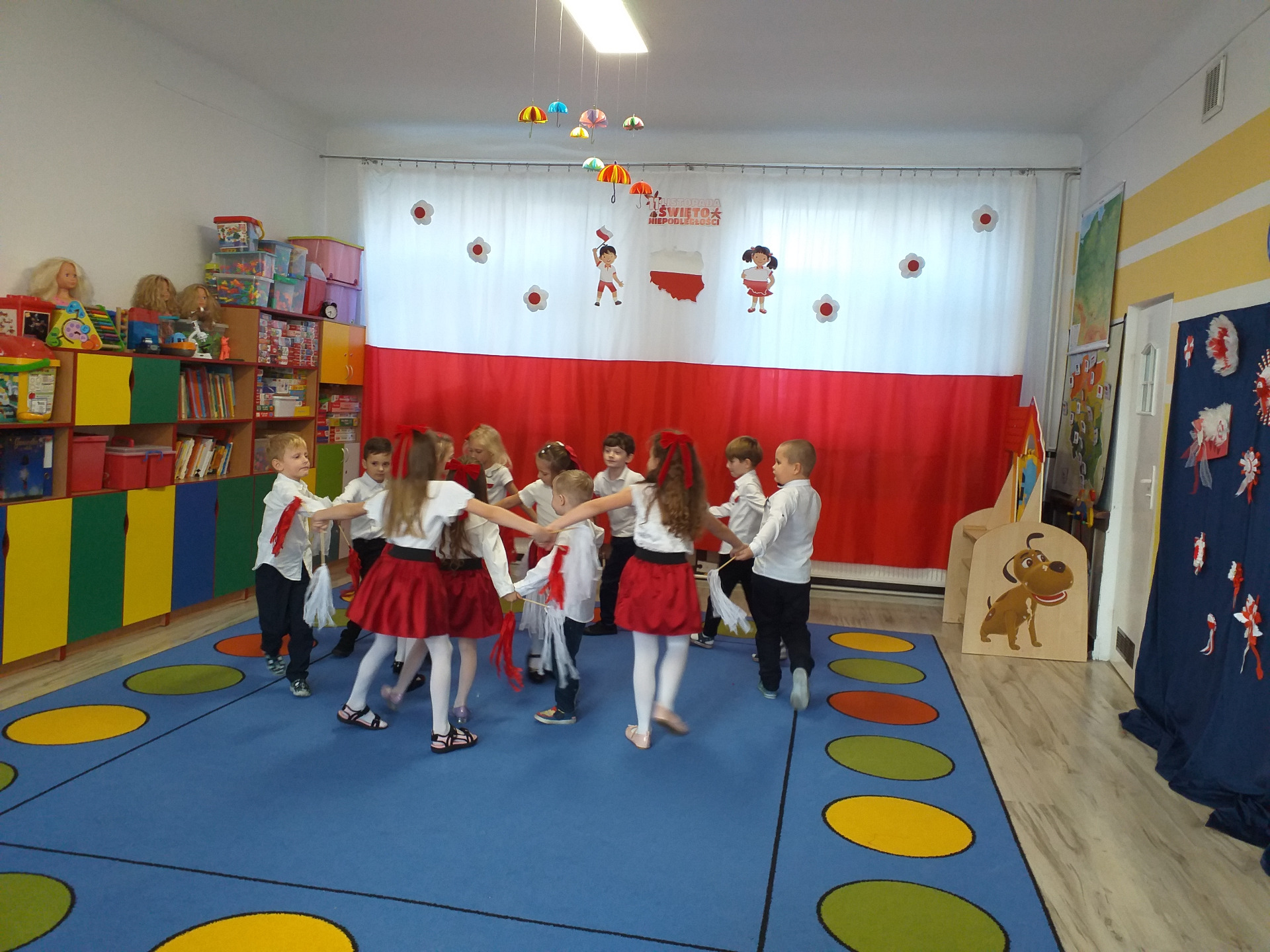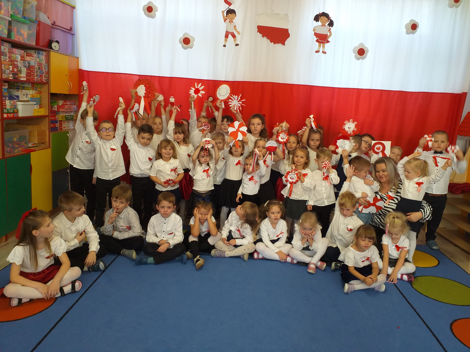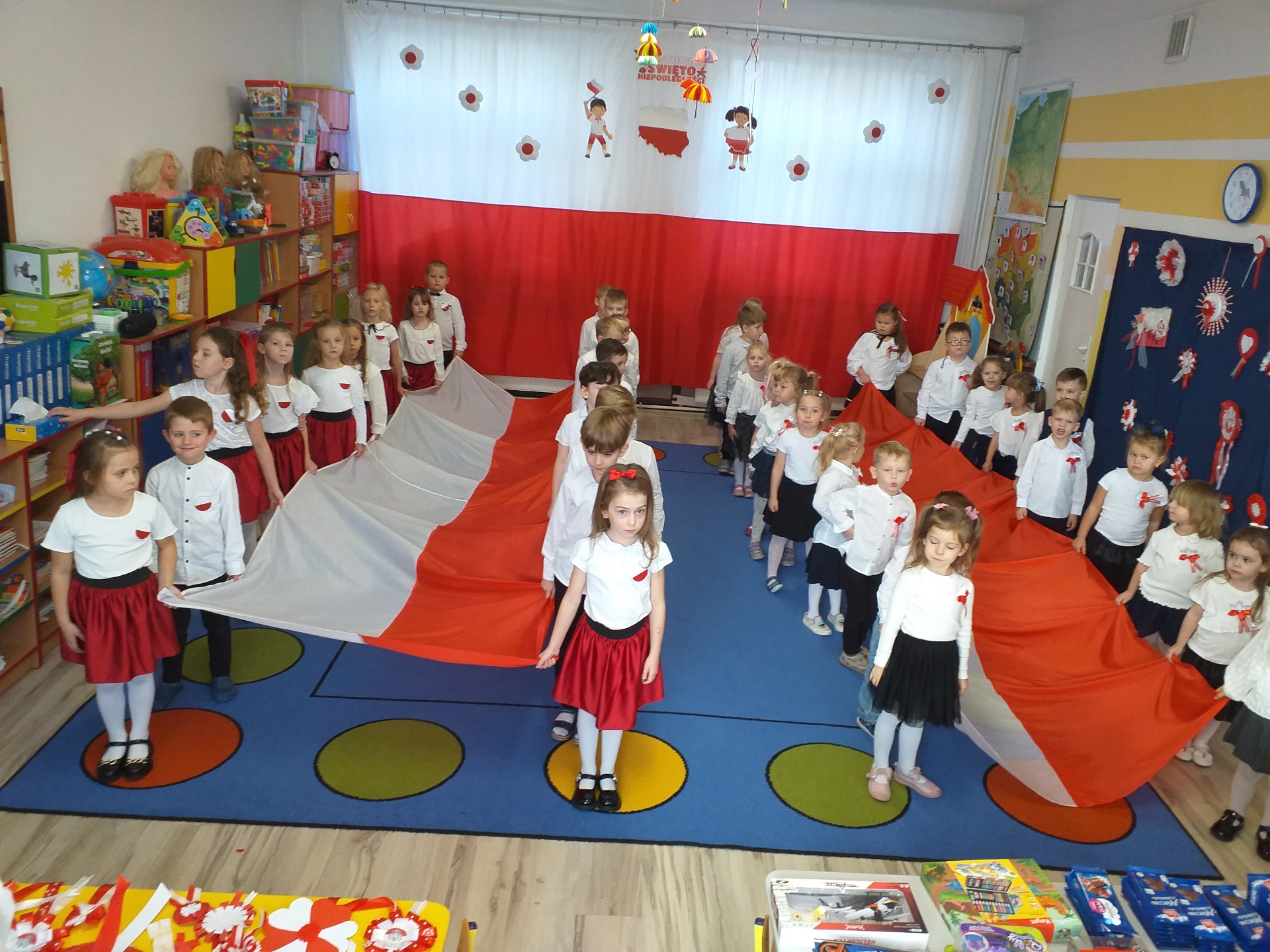 Dnia 07 listopada obchodziliśmy w naszym przedszkolu Święto Niepodległości. Z tej okazji wszystkie dzieci przyszły ubrane na galowo i uroczyście świętowali ten wyjątkowy dla Nas dzień. Ten dzień rozpoczął się rozstrzygnięciem konkursu "KOTYLION NARODOWY” Uroczystość dzieci rozpoczęły od tańca, następnie dumnie, przyjmując właściwą postawę „na baczność”, odśpiewały Hymn Polski „Mazurek Dąbrowskiego”. Głównym celem spotkania było kształtowanie miłości i przywiązania do naszego kraju ojczystego, jego kultury i tradycji oraz poznanie symboli narodowych naszego kraju. Dzięki udziałowi w tego typu uroczystościach przedszkolaki od najmłodszych lat uczą się patriotyzmu, kształtują pozytywne postawy i uczucia patriotyczne.