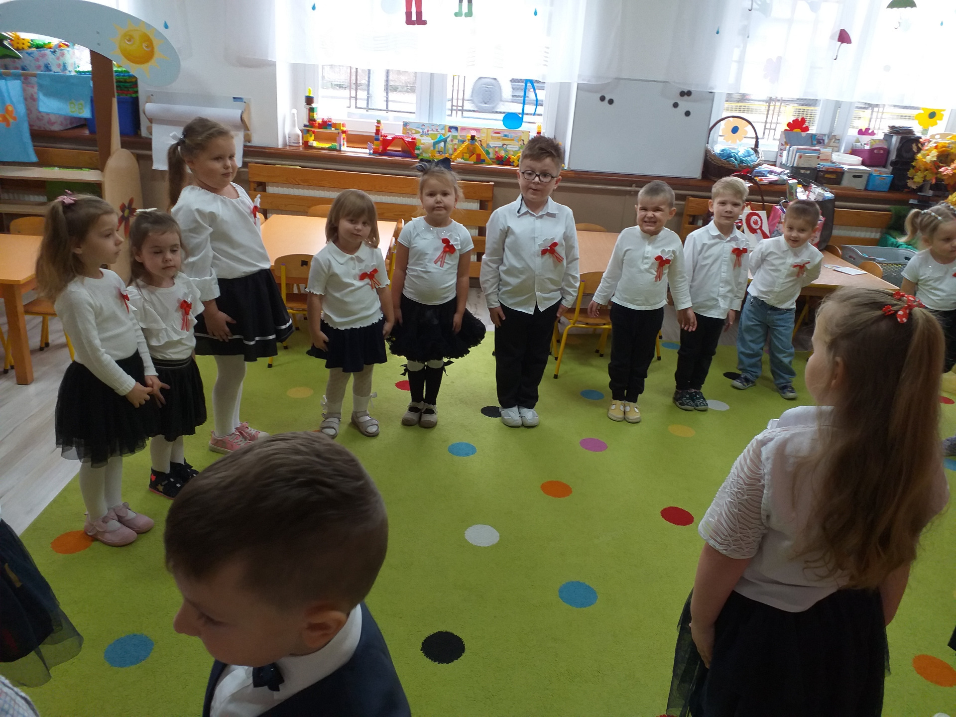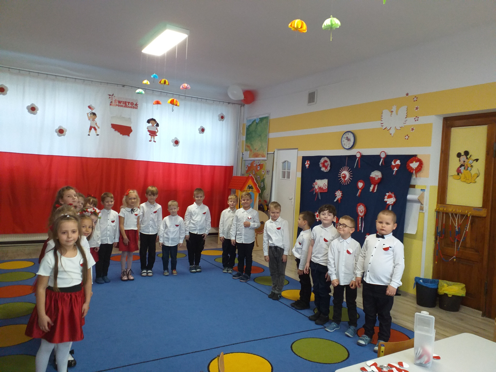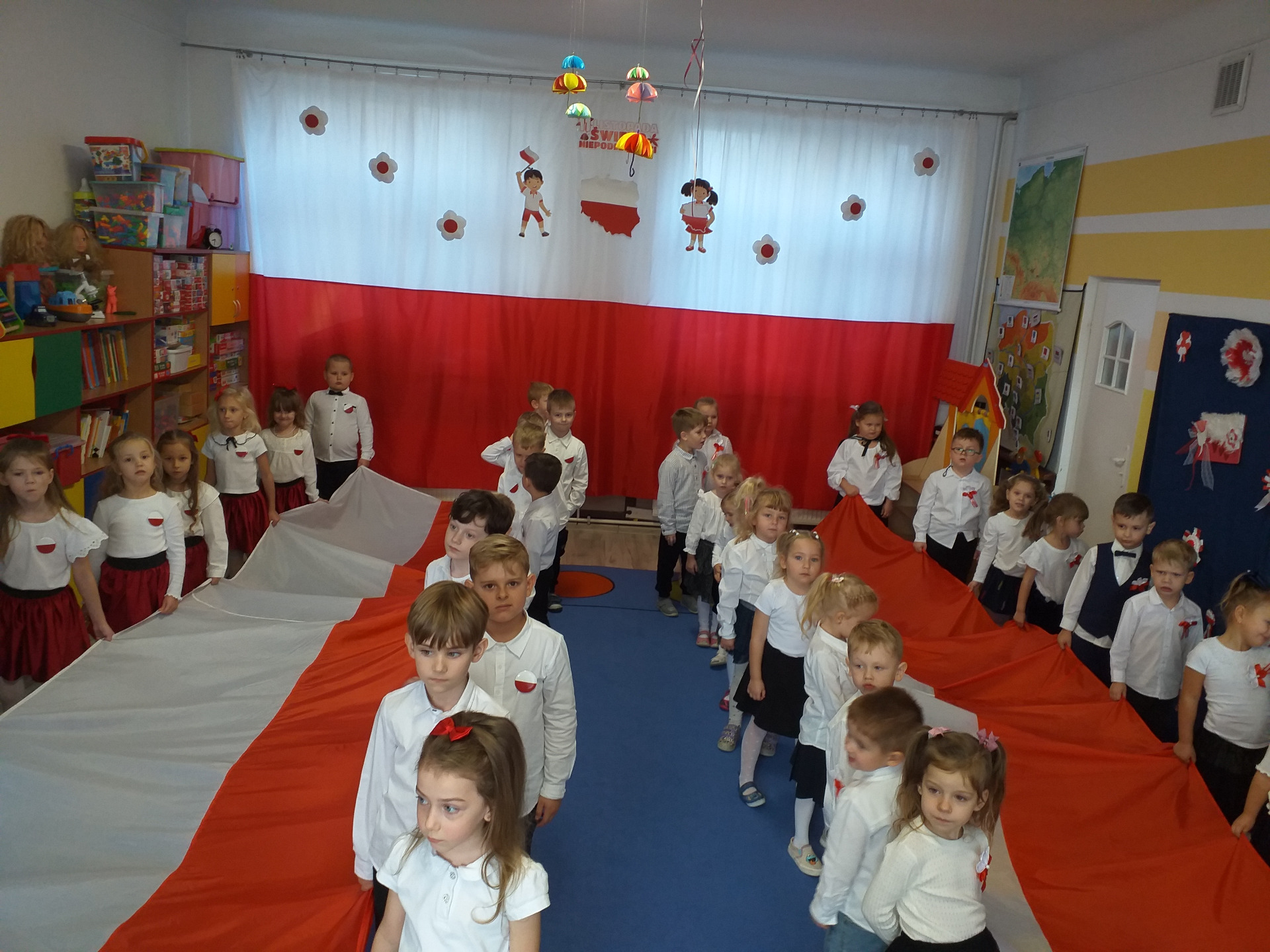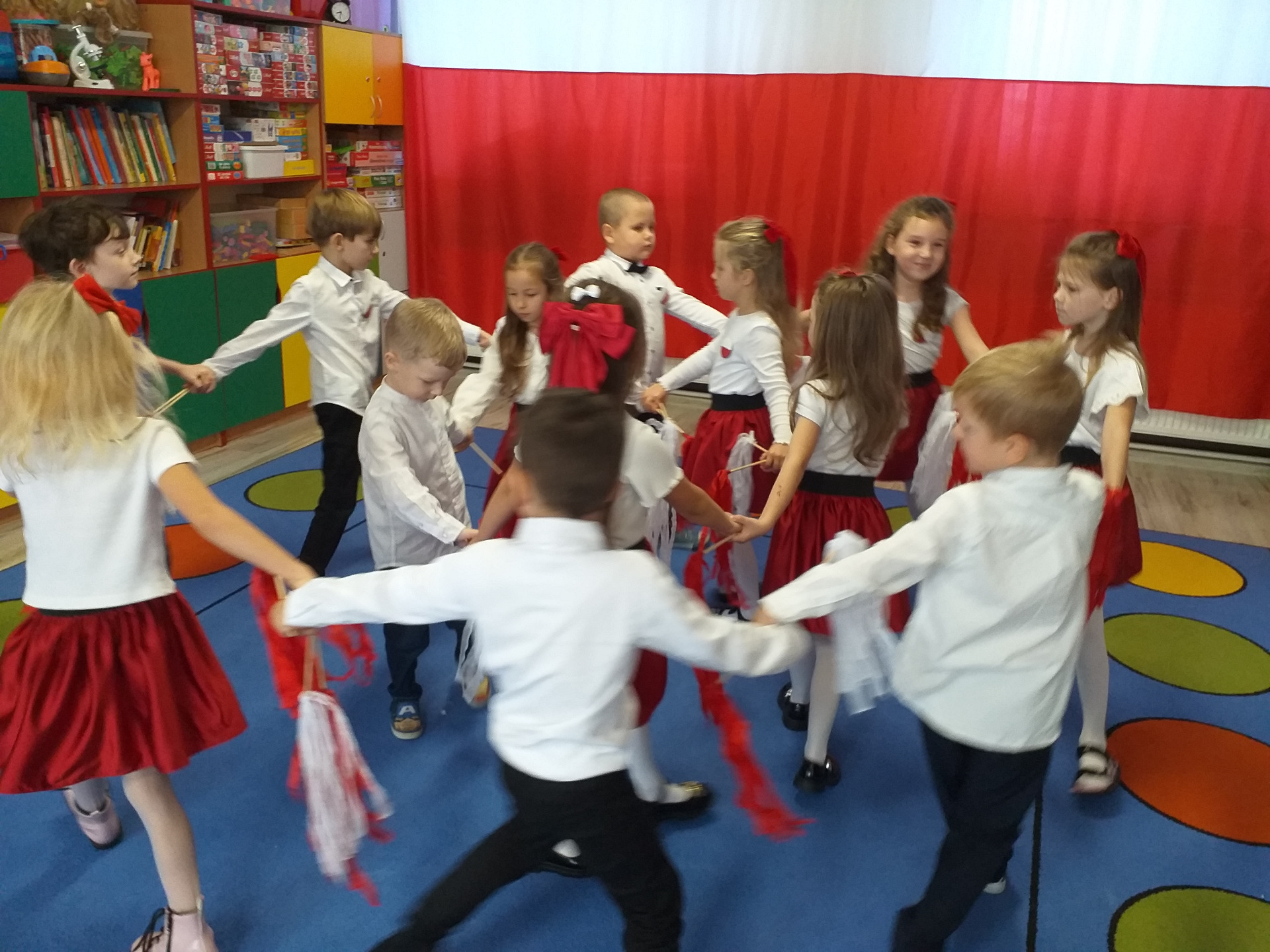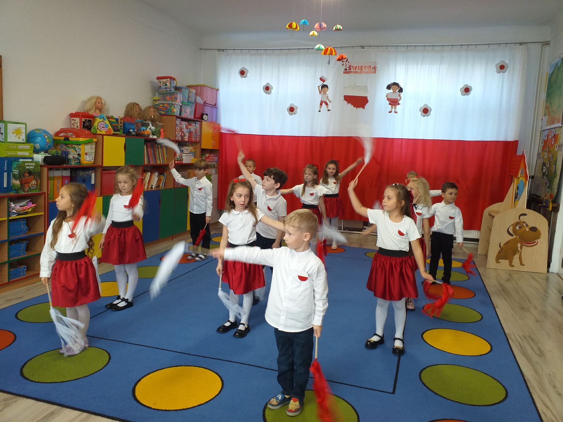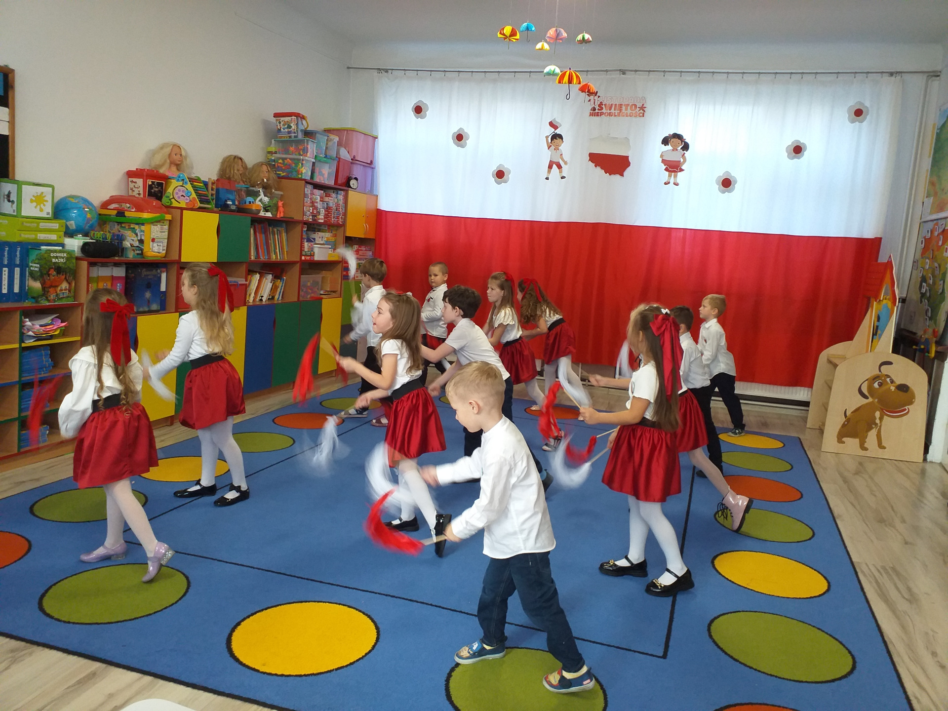 Dnia 07 listopada obchodziliśmy w naszym przedszkolu Święto Niepodległości. Z tej okazji wszystkie dzieci przyszły ubrane na galowo i uroczyście świętowali ten wyjątkowy dla Nas dzień. Ten dzień rozpoczął się rozstrzygnięciem konkursu "KOTYLION NARODOWY” Uroczystość dzieci rozpoczęły od tańca, następnie dumnie, przyjmując właściwą postawę „na baczność”, odśpiewały Hymn Polski „Mazurek Dąbrowskiego”. Głównym celem spotkania było kształtowanie miłości i przywiązania do naszego kraju ojczystego, jego kultury i tradycji oraz poznanie symboli narodowych naszego kraju. Dzięki udziałowi w tego typu uroczystościach przedszkolaki od najmłodszych lat uczą się patriotyzmu, kształtują pozytywne postawy i uczucia patriotyczne.